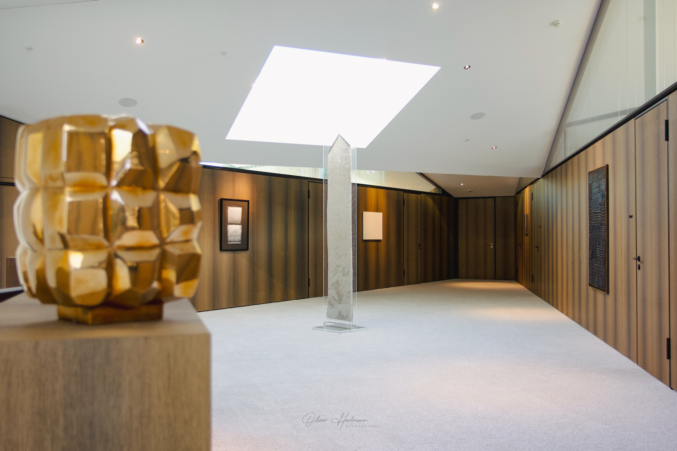 The interior architecture of Bank First Advisory in Vaduz is a seamless blend of modern design and classic elegance. Upon entering, visitors are greeted by a spacious reception area that impresses with its clean lines and high-quality materials. Rich woods, polished marble, and expansive glass panels dominate the space, creating an open, light-filled atmosphere.